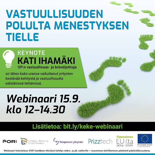 Webinaari toteutetaan ESR-hankkeen Kestävä kehitys mikro- ja pk-sektorilla – osaamisen kehittämisen pilotointi päätöstilaisuutena.